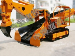 ZWY-150液压扒装机是一种连续生产的高效率出矿设备。主要用于矿山巷道掘进、铁路隧道施工、引水洞和国防洞窟施工中的装载作业。适用于坡度≤25o 的大、中型巷道。机器工作条件是:岩石的普氏硬度f12,块度≤700mm。本机靠履带推进铲取岩石并通过铲斗将石料扒进自身的刮板输送机,输送机从尾部将岩石卸入自卸汽车、梭式矿车或其它转载设备上去。同时也可利用反铲挖掘臂扒取远处的岩石,也可以用铲斗来清理工作面。