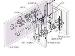 气幕喷淋装置是煤矿井下避难硐室或救生舱的重要组成部分,是将压缩空气通过喷气气幕管形成气幕,在避难硐室防护密闭门处形成一个相对隔绝的密闭室,过渡室上部的喷淋设备释放大量的气流,单向换气阀将有毒气体替换出去,不会随着避险人员进入到生存室内。
